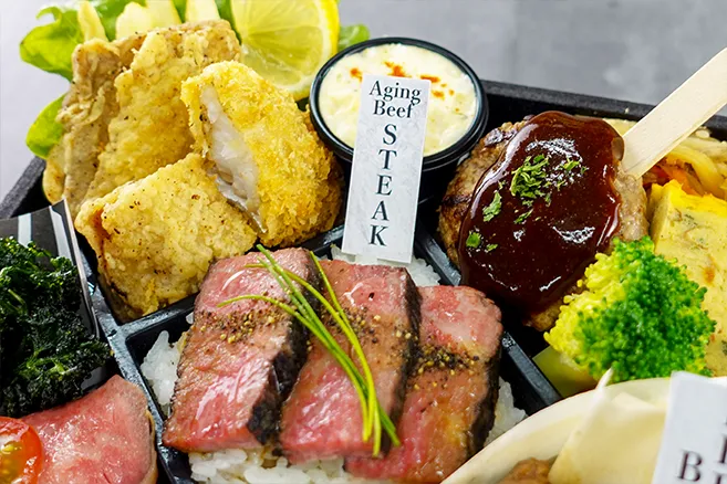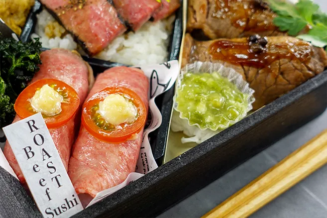 ウェットエイジング熟成で仕上げた柔らかいステーキ重に、ローストとBBQの2種からなる肉寿司を盛り込みました。
